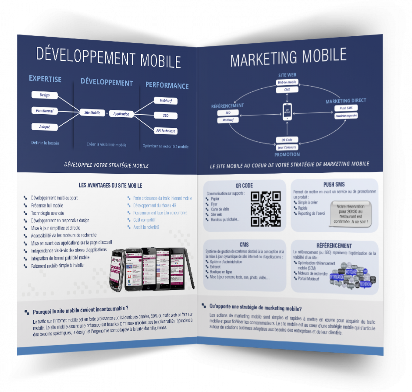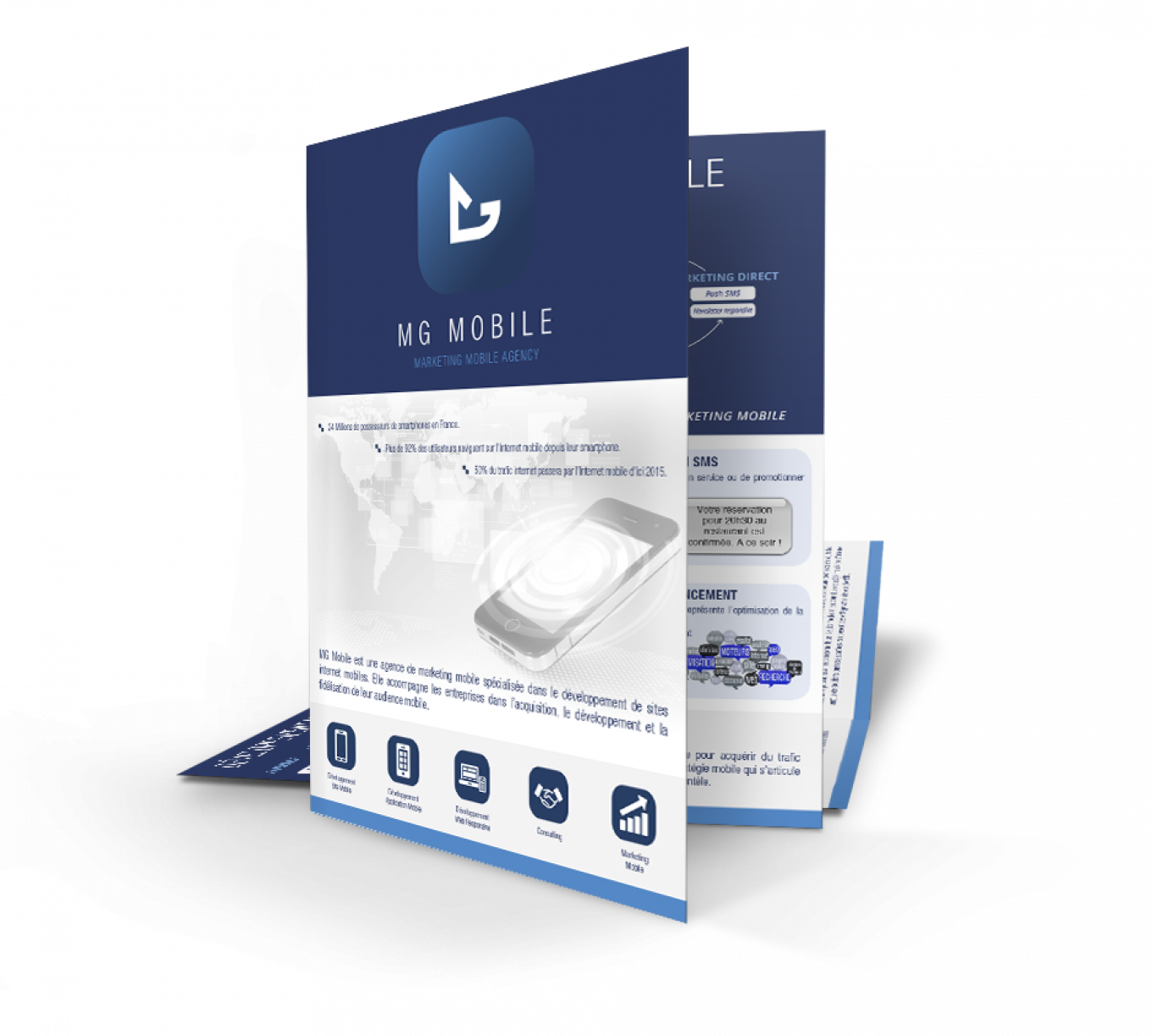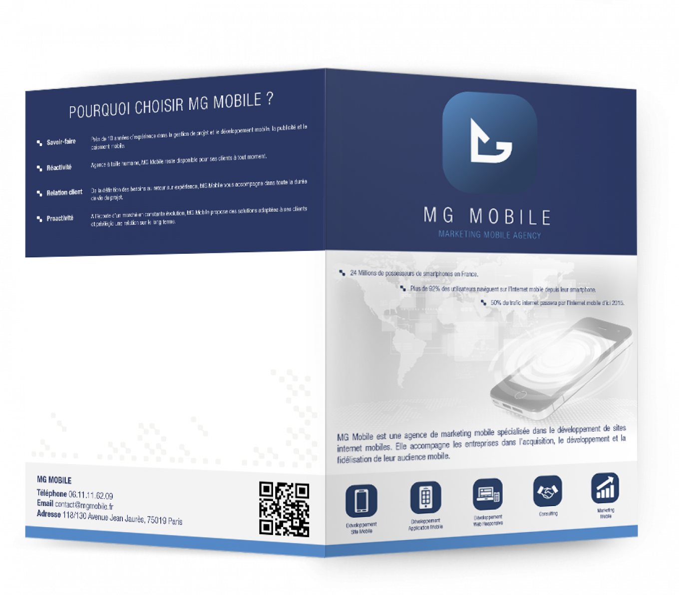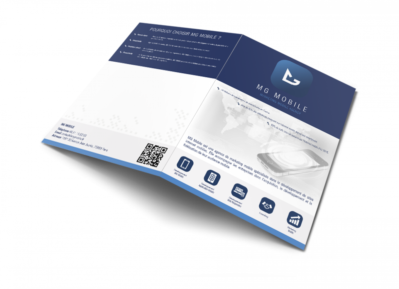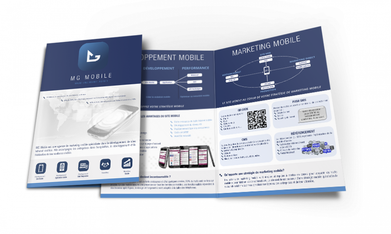Création d’un dépliant de présentation commerciale ainsi que son identité visuelle et sa charte graphique, pour l’entreprise MG Mobile spécialisé dans le site web et mobile.
