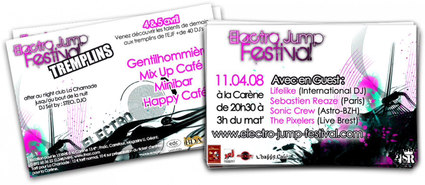 Campagne de communication comprenant affiches et flyers pour le festival Electro Jump Festival de Brest.