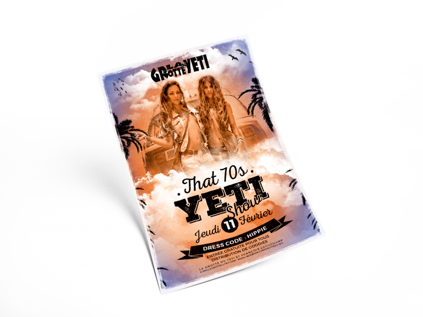 Affiche/flyer pour une soirée à thème dans les bars de La Grotte Du Yéti.