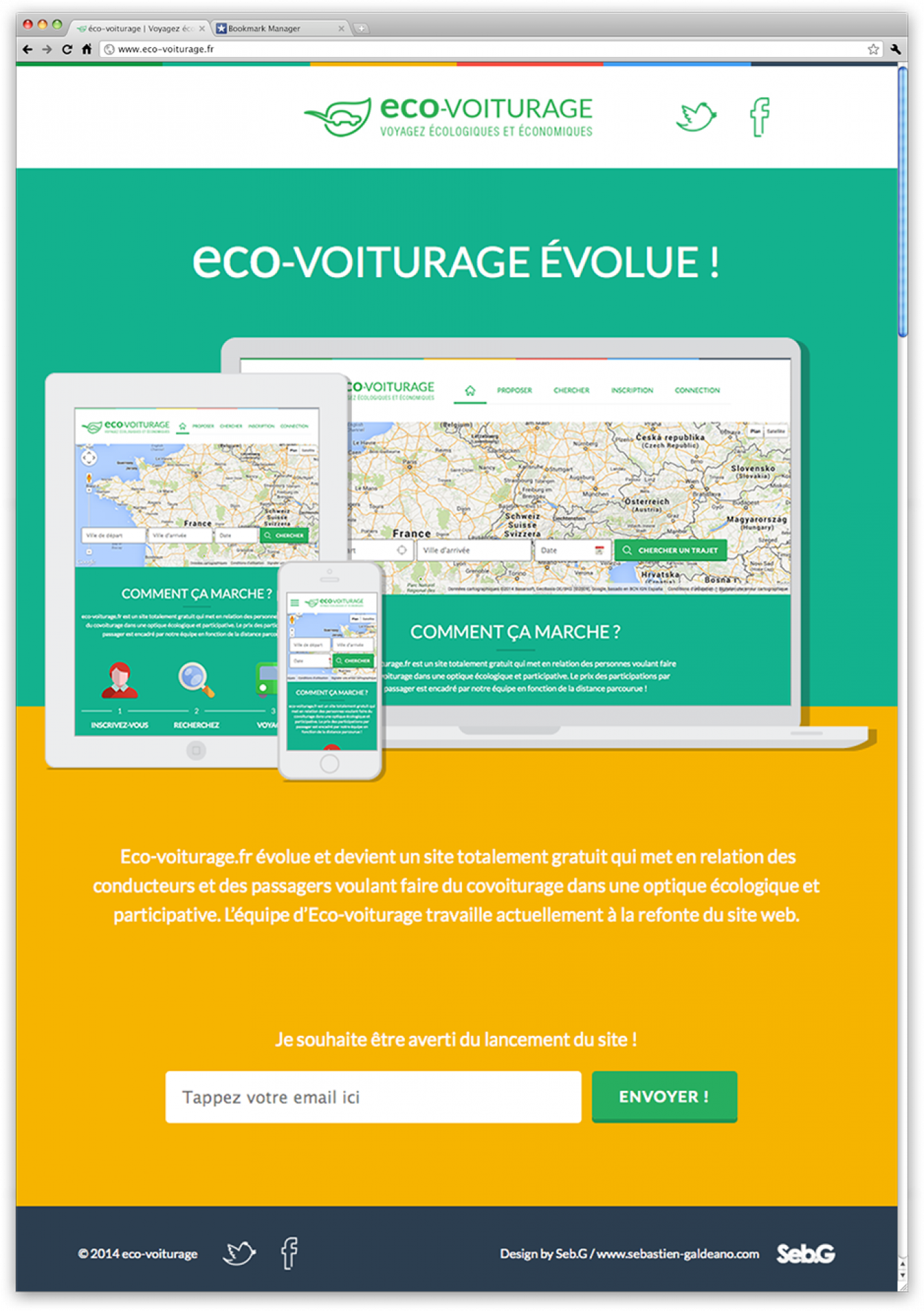 Création de la charte graphique et du concept du nouveau site de covoiturage à tendance écologique nommé eco-voiturage. Voici la page d’attente avant le lancement du site que j’ai designé et intégré en html5/css3.