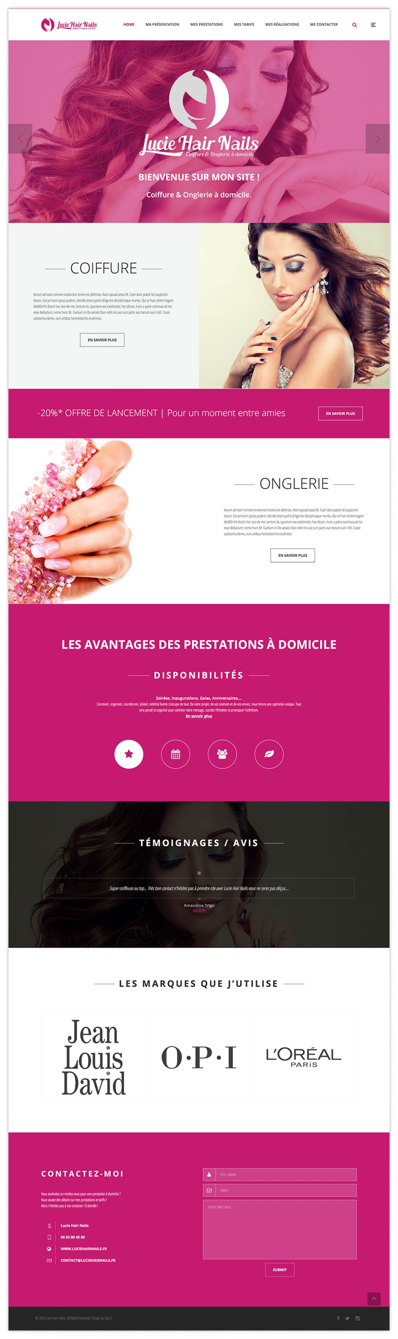 Site complet de Lucie Hair Nails réalisé à partir d’un template wordpress responsive. Presque tout a été revu graphiquement sur le template (couleur, typo, espacement, fond, …)